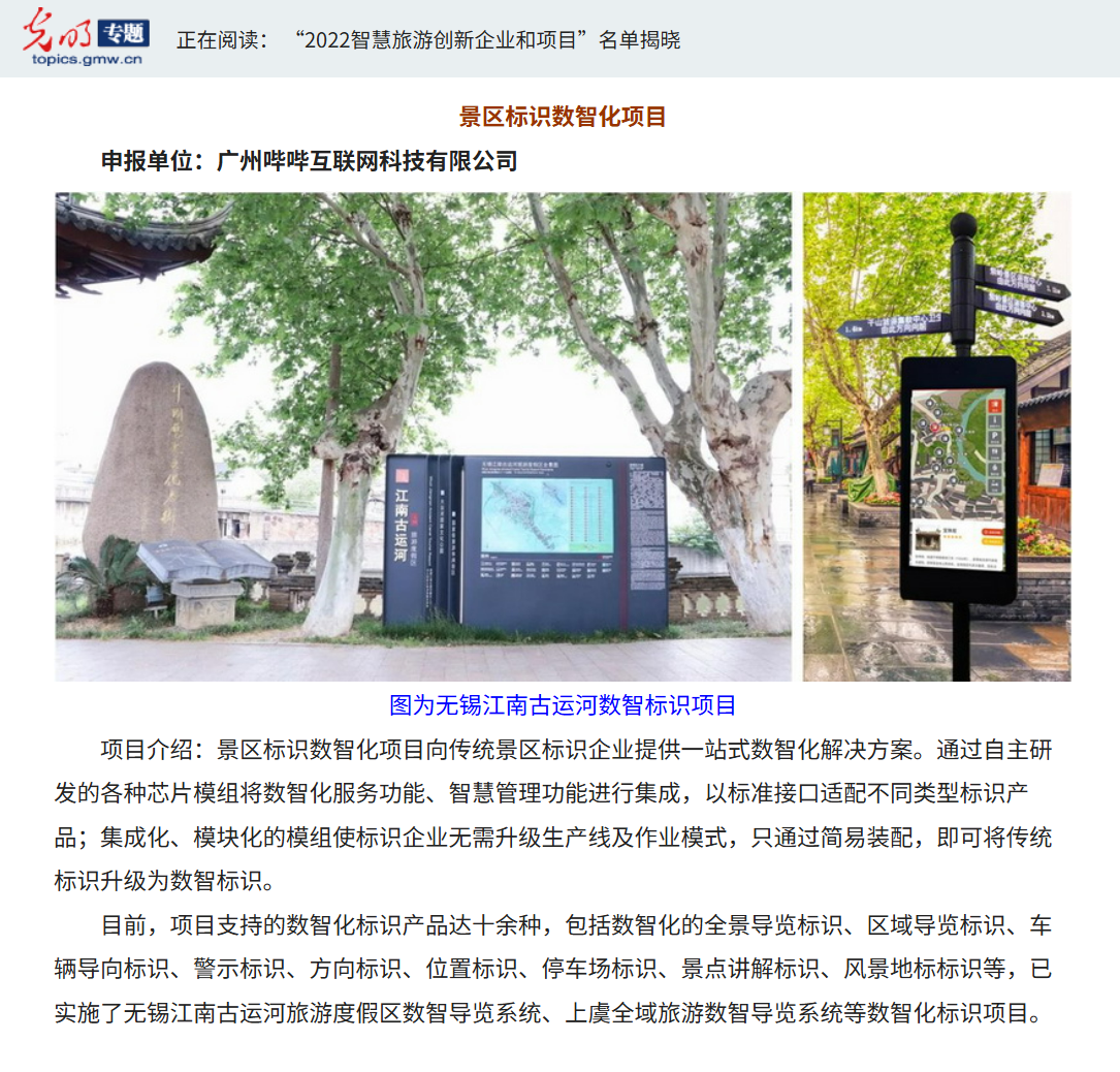 其中由广州哔哔互联网科技有限公司(现更名为:广州美景智联信息技术有限公司)报名参评的“景区标识数智化项目”入选“2022智慧旅游创新项目”。