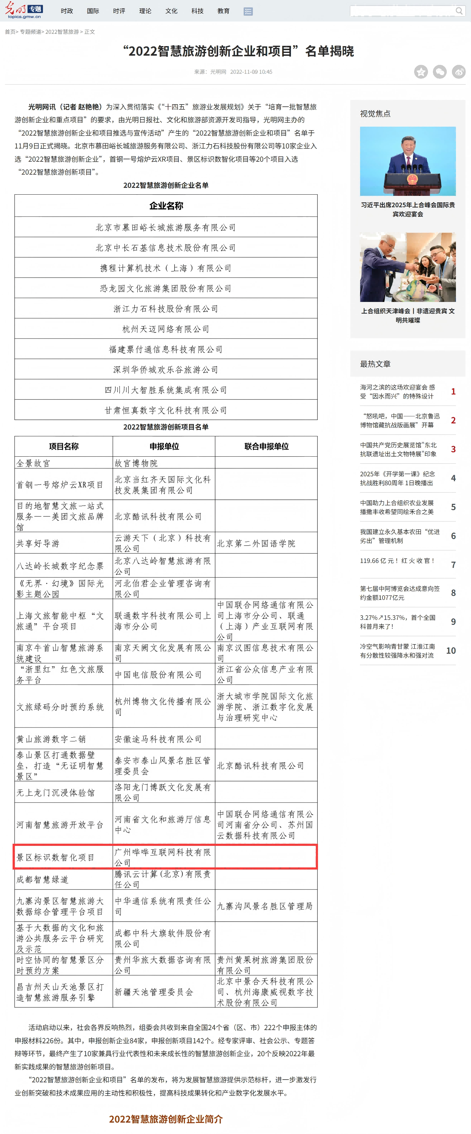 光明网:“2022智慧旅游创新企业和项目”名单揭晓